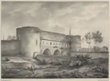 ![]() Représentation ancienne du Pont des Trous. La courtine a encore sa toiture d'ardoise mais les tours n'ont plus les leurs. |
