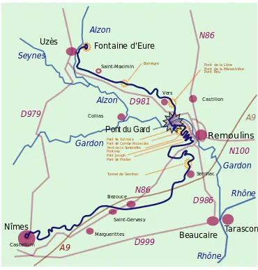 Le pont du Gard est la partie monumentale d'un aqueduc de plus de 52 km de longueur (52 702 m), qui apportait l'eau de la Fontaine d'Eure, située au pied d'Uzès, jusqu'à la ville romaine de Nemausus, aujourd'hui Nîmes[4], alors à son apogée. Les eaux de la source proviennent en partie de la rivière d'Alzon, qui passe par les environs d'Uzès, et des eaux récoltées du mont Bouquet, situé plus près d'Alès. L'aqueduc proprement dit est un chef-d'œuvre d'ingénierie, témoignage de l'extraordinaire maîtrise des constructeurs anciens : le dénivelé entre les points de départ et d'arrivée n'est que de 12,6 m, la pente moyenne générale étant de 24,8 cm par km. À cause du relief, l'aqueduc serpente à travers les petites montagnes et vallées des garrigues d'Uzès et de Nîmes[5].