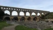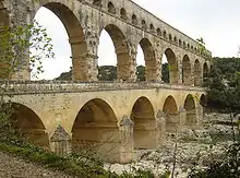 Le pont du Gard est un pont à trois niveaux destiné au passage d'un aqueduc romain. Il est situé à Vers-Pont-du-Gard entre Uzès et Remoulins, non loin de Nîmes, dans le département français du Gard. Il enjambe le Gardon. Probablement bâti dans la première moitié du Ier siècle, il assurait la continuité de l'aqueduc romain qui conduisait l’eau d’Uzès à Nîmes. D'après les dernières recherches, il aurait cessé d'être utilisé au début du VIe siècle.