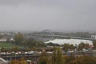 |   Le pont ferroviaire des Anglais vu depuis le chemin de halage à Bezons. | |