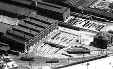Pont transbordeur en fosse, desservant un bâtiment, aux États-Unis.