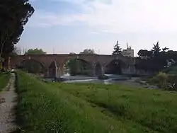 Effondré à plusieurs reprises et toujours reconstruit, le pont romain a finalement été remplacé par un pont de pierre, construit un peu en aval par la volonté d'Andrea Malatesta, puis complété par la suite par Domenico Malatesta Novello.