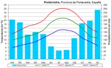 La ville est sous un climat océanique doux Cfb[66] d'après le classement climatique Köppen. La température moyenne est de 14,8 °C. Les hivers sont humides et en moyenne doux. Les étés sont relativement secs, modérément chauds et ensoleillés. Pontevedra bénéficie d'environ 2 223 heures d'ensoleillement chaque année, ce qui en fait la ville la plus ensoleillée de la Galice.