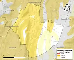 Le retrait-gonflement des sols argileux est susceptible d'engendrer des dommages importants aux bâtiments en cas d’alternance de périodes de sécheresse et de pluie[30]. 64,4 % de la superficie communale est en aléa moyen ou fort (59 % au niveau départemental et 48,5 % au niveau national)[Carte 4]. Depuis le , en application de la loi ELAN, différentes contraintes s'imposent aux vendeurs, maîtres d'ouvrages ou constructeurs de biens situés dans une zone classée en aléa moyen ou fort[Note 6],[31].
