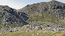 Le port de Siguer, matérialisé par un grand cairn, encadré par deux grands sommets bien individualisés, le pic du Port de Siguer et le pic de Thoumasset, domine l'étang Blaou, sur le versant français.