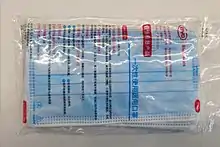 Le masque FFP2, correctement posé (sans espace entre le visage et le masque), empêche d'inhaler le virus [réf. nécessaire]. Le masque filtrant respiratoire le plus utilisé dans l'Union européenne est le masque FFP2, son correspondant américain est le masque N95 et l'équivalent chinois est le masque KN95[30],[31],[32]. Ce dernier est un type de masque respiratoire filtrant les particules qui répond à la classification de filtration de l'air (en) N95 de la NIOSH, l'Institut national américain pour la sécurité et la santé au travail, ce qui signifie qu'il filtre au moins 95% des particules en suspension dans l'air, sans être résistant à l'huile comme le P95. Le N95 est un masque à filtre mécanique (en), qui offre une protection contre les particules, mais pas contre les gaz ou les vapeurs[33]. Comme le masque chirurgical, le masque N95 est fait de tissu non tissé en polypropylène soufflé par fusion[34],[35].