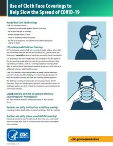 En , aux États-Unis, les Centers for Disease Control and Prevention (CDC) ont recommandé que le grand public porte un couvre-visage en tissu dans les lieux publics où d'autres mesures de distanciation sociale sont difficiles à maintenir, comme les épiceries et les pharmacies, en raison de l'importance de la transmission asymptomatique et pré-symptomatique de la maladie[70],[71].