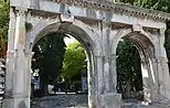 La double porte, comme son nom l'indique, se dresse avec trois demi-colonnes corinthiennes entre et de chaque côté des deux arches. Les colonnes supportent un entablement avec sa frise et sa corniche, mais l'architrave manque [6]. La couronne en relief de la corniche relie l'ensemble en un tout harmonieux.