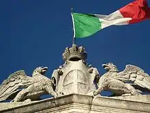 Le lion de Saint Marc a été détruit par les Jacobins en 1801 et remplacé plus tard par un groupe sculptural avec un blason au centre portant l'aigle impériale à deux têtes, plus tard arasée, surmonté d'une couronne[17].