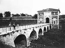 La position a été établie de façon intermédiaire par rapport aux portes médiévales préexistantes : Porta Nova ou Santo Zenone, où convergeaient les routes de Brescia et Chievo[2].