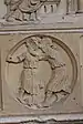 Au-dessous des apôtres, vingt-quatre bas-reliefs, disposés sur deux rangs superposés, illustrent douze « vertus » (rang supérieur, dans des arcs trilobés soutenus par des paires de colonnettes), à chacune desquelles se rapportent les « vices » (rang inférieur, dans des médaillons séparés par des triglyphes). Les premières sont représentées comme des allégories féminines sur un trône, tandis que les dernières sont représentées par des scènes concrètes de péché, selon le schéma suivant[24] :
