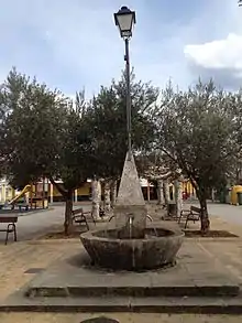 |   Vue sur le Plaza, l'église et la fontaine. | ||||