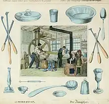 Le métier de potier d’étain se développa au cours du XIIIe siècle, avec le remplacement progressif de la poterie de terre et des ustensiles en bois tourné par de la vaisselle métallique. La tâche principale de potier d'étain consistait à écrouir au marteau l’étain coulé en feuilles, à l’instar des batteurs d’or et d’argent.