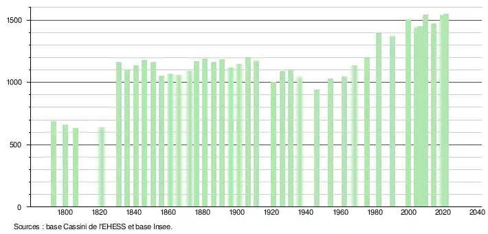 L'évolution du nombre d'habitants est connue à travers les recensements de la population effectués dans la commune depuis 1793. Pour les communes de moins de 10 000 habitants, une enquête de recensement portant sur toute la population est réalisée tous les cinq ans, les populations légales des années intermédiaires étant quant à elles estimées par interpolation ou extrapolation[15]. Pour la commune, le premier recensement exhaustif entrant dans le cadre du nouveau dispositif a été réalisé en 2004[16].
