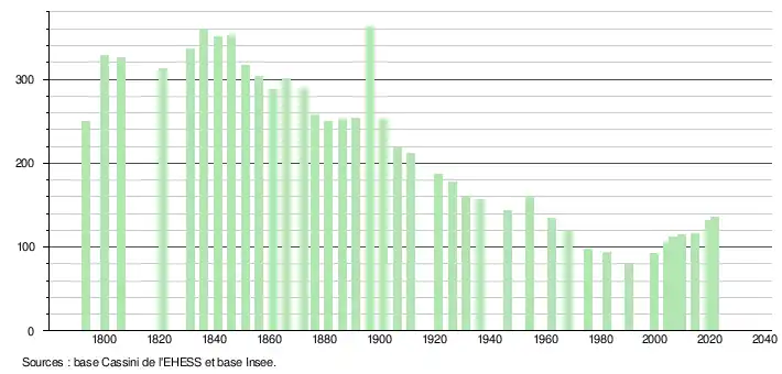 L'évolution du nombre d'habitants est connue à travers les recensements de la population effectués dans la commune depuis 1793. Pour les communes de moins de 10 000 habitants, une enquête de recensement portant sur toute la population est réalisée tous les cinq ans, les populations légales des années intermédiaires étant quant à elles estimées par interpolation ou extrapolation[13]. Pour la commune, le premier recensement exhaustif entrant dans le cadre du nouveau dispositif a été réalisé en 2004[14].