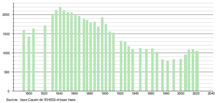 L'évolution du nombre d'habitants est connue à travers les recensements de la population effectués dans la commune depuis 1793. Pour les communes de moins de 10 000 habitants, une enquête de recensement portant sur toute la population est réalisée tous les cinq ans, les populations légales des années intermédiaires étant quant à elles estimées par interpolation ou extrapolation[16]. Pour la commune, le premier recensement exhaustif entrant dans le cadre du nouveau dispositif a été réalisé en 2005[17].