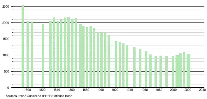 L'évolution du nombre d'habitants est connue à travers les recensements de la population effectués dans la commune depuis 1793. Pour les communes de moins de 10 000 habitants, une enquête de recensement portant sur toute la population est réalisée tous les cinq ans, les populations légales des années intermédiaires étant quant à elles estimées par interpolation ou extrapolation[41]. Pour la commune, le premier recensement exhaustif entrant dans le cadre du nouveau dispositif a été réalisé en 2004[42].