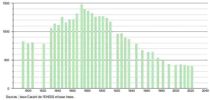 L'évolution du nombre d'habitants est connue à travers les recensements de la population effectués dans la commune depuis 1793. Pour les communes de moins de 10 000 habitants, une enquête de recensement portant sur toute la population est réalisée tous les cinq ans, les populations légales des années intermédiaires étant quant à elles estimées par interpolation ou extrapolation[20]. Pour la commune, le premier recensement exhaustif entrant dans le cadre du nouveau dispositif a été réalisé en 2006[21].
