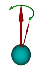 où est le couple, est le moment magnétique dipolaire, est le vecteur moment cinétique, est le champ magnétique, est le produit vectoriel, et est le rapport gyromagnétique donnant la constante de proportionnalité entre le moment magnétique et le moment angulaire.