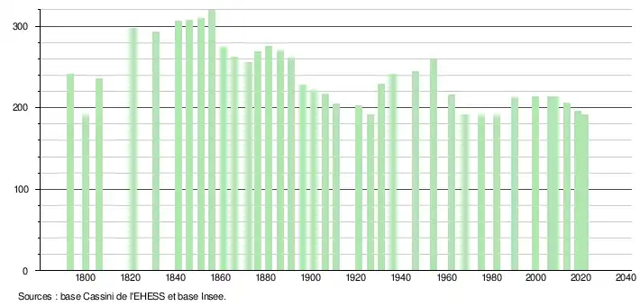 L'évolution du nombre d'habitants est connue à travers les recensements de la population effectués dans la commune depuis 1793. Pour les communes de moins de 10 000 habitants, une enquête de recensement portant sur toute la population est réalisée tous les cinq ans, les populations légales des années intermédiaires étant quant à elles estimées par interpolation ou extrapolation[37]. Pour la commune, le premier recensement exhaustif entrant dans le cadre du nouveau dispositif a été réalisé en 2008[38].