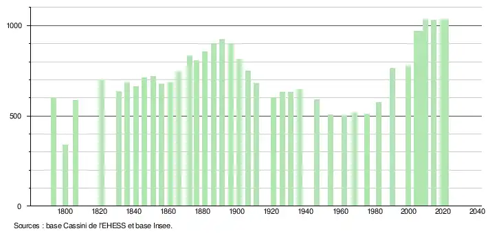 L'évolution du nombre d'habitants est connue à travers les recensements de la population effectués dans la commune depuis 1793. Pour les communes de moins de 10 000 habitants, une enquête de recensement portant sur toute la population est réalisée tous les cinq ans, les populations légales des années intermédiaires étant quant à elles estimées par interpolation ou extrapolation[22]. Pour la commune, le premier recensement exhaustif entrant dans le cadre du nouveau dispositif a été réalisé en 2004[23].