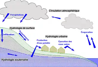La pluviométrie est l'étude des cumuls de pluie, de neige ou de toute autre forme d'eau grâce à des instruments de mesure in situ ou par télémétrie. Les accumulations à l'état solide viennent s'ajouter par alimentation à un glacier ou à un champ de neige ; le contraire est l'ablation[15]. Le cumul de précipitations liquides et solides est l'un des facteurs conditionnant le climat et par conséquent le développement des sociétés humaines et est souvent un enjeu géopolitique.