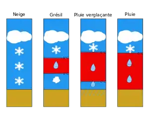 Ces cristaux finiront également par tomber et entreront en coalescence avec d'autres pour former des flocons de neige. Ils captureront également par coalescence des gouttes ce qui les givrera si la température est sous zéro degré Celsius. Si la température de l'atmosphère est partout sous zéro au-dessus du sol, on aura de la neige. Par contre, si le niveau de congélation n'est pas au sol ou s'il y a des couches au-dessus du zéro en altitude, on aura une variété de types de précipitations : pluie, pluie verglaçante, grésil, etc.