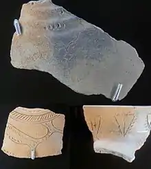 - La culture de Fengpitou (鳳 鼻頭) (1500-0 av.n. ère), ou Fengbitou (鳳鼻頭遺址, Fèngbítóu Yízhǐ, site éponyme au sud-ouest de l'île)[34] en est une, caractérisée par une céramique rouge au fin décor cordé, a été découverte dans les îles Penghu et dans les parties centrales et méridionales de la côte ouest de l'île de Taïwan ; une culture à la céramique semblable occupait les zones côtières orientales.