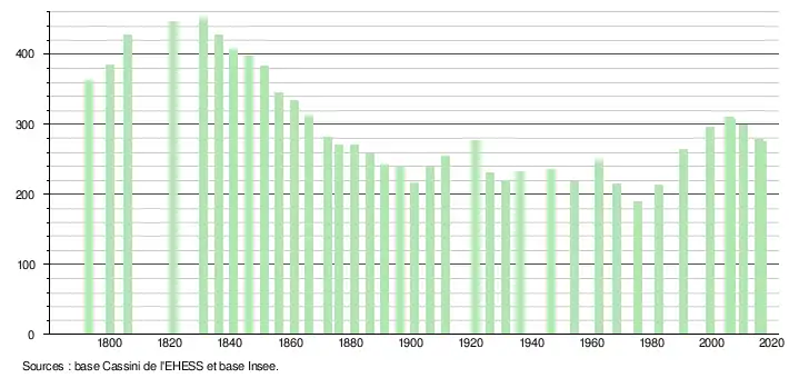 L'évolution du nombre d'habitants est connue à travers les recensements de la population effectués dans la commune depuis 1793. Pour les communes de moins de 10 000 habitants, une enquête de recensement portant sur toute la population est réalisée tous les cinq ans, les populations légales des années intermédiaires étant quant à elles estimées par interpolation ou extrapolation[2]. Pour la commune, le premier recensement exhaustif entrant dans le cadre du nouveau dispositif a été réalisé en 2005[3].