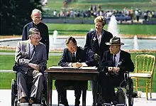 En , Bush et Gorbatchev signèrent le traité de réduction des armes stratégiques (START I), le premier accord d'importance concernant les armes nucléaires depuis le traité sur les forces nucléaires à portée intermédiaire en 1987[55]. Les deux pays acceptaient de réduire leur stock d'armes nucléaires de 30 % et l'Union soviétique promettait de diminuer de 50 % son arsenal de missiles balistiques intercontinentaux[56]. L'historien Pierre Mélandri note que cet accord « assure un avantage évident à l'Amérique » dans la mesure où « les réductions affectent en priorité les missiles lourds mirvés qui ont toujours été le principal atout des Soviétiques »[57]. En , des communistes partisans d'une « ligne dure » organisèrent un putsch contre Gorbatchev qui échoua rapidement, mais qui brisa le peu d'autorité qui restait à Gorbatchev et au gouvernement central soviétique[58]. Le même mois, Gorbatchev démissionna de son poste de secrétaire général du Parti communiste et le président russe Boris Eltsine ordonna la saisie des biens soviétiques. Gorbatchev resta au pouvoir comme président de l'Union soviétique jusqu'à la dissolution de l'URSS au mois de décembre[59]. Des ruines de l'Union soviétique naquirent quinze nouveaux États, la Russie étant le plus grand et le plus peuplé. Bush et Eltsine se rencontrèrent en et inaugurèrent à cette occasion une « nouvelle ère d'amitié et de partenariat »[60]. En , les deux dirigeants signèrent le traité START II qui prévoyait une nouvelle réduction des arsenaux nucléaires par rapport au traité initial[61].