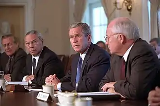 Étant donné la relative inexpérience de Bush dans le domaine des relations internationales, la politique étrangère des États-Unis fut, sous sa présidence, en grande partie élaborée par de hauts responsables dont plusieurs avaient auparavant servi dans l'administration de son père : ainsi du vice-président Cheney (comme secrétaire à la Défense), de la conseillère à la Sécurité nationale Condoleezza Rice (en tant que membre du Conseil de sécurité nationale) et des secrétaires adjoints Paul Wolfowitz et Richard Armitage ; de même, le secrétaire d'État Colin Powell avait exercé les fonctions de chef d'état-major des armées sous le mandat de Bush père de 1989 à 1993[8]. Powell, dont Bush était un admirateur de longue date, fut le premier choix du président pour diriger le département d'État mais le secrétaire à la Défense Donald Rumsfeld, qui avait déjà occupé ce poste sous la présidence de Gerald Ford, joua également un rôle essentiel sur toutes les questions relatives à la sécurité nationale[9]. Rumsfeld et Cheney, qui se connaissaient bien pour avoir travaillé ensemble du temps de l'administration Ford, s'affirmèrent comme les principaux architectes de la politique étrangère américaine au cours du premier mandat de Bush[10].
