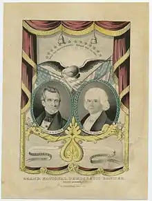 Durant la guerre américano-mexicaine, les généraux Taylor et Scott s'étaient révélés comme des candidats potentiels pour le Parti whig, de même que le sénateur Thomas Corwin, opposé à la guerre, et le chef du parti de longue date, Henry Clay. La popularité de Taylor gagna en importance à mesure que la guerre continuait et il déclara en 1847 qu'il n'excluait pas l'idée de se porter candidat à la présidence[146]. La convention nationale whig qui se déroula le mit aux prises Taylor, Clay, Scott et le sénateur du Massachusetts Daniel Webster. Taylor arriva en tête du premier tour juste devant Clay et parvint à rassembler suffisamment de soutiens autour de sa candidature pour décrocher la nomination au quatrième tour de scrutin. Clay déplora le choix de Taylor car ce dernier, très ambigu sur le plan idéologique, ne disposait pas d'un programme politique précis[147]. Polk critiqua également Taylor en privé en affirmant à son sujet : « il n'est pas du tout qualifié »[148]. Un ancien membre du Congrès originaire de l'État de New York, Millard Fillmore, fut désigné en tant que colistier[147].