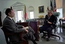 Pierre Salinger, qui avait été nommé par Kennedy au poste de porte-parole de la Maison-Blanche, démissionna en et fut remplacé par George Reedy, un fidèle de Johnson. Horace Busby servit essentiellement comme rédacteur de discours et analyste politique. Bill Moyers était le plus jeune membre de l'administration Johnson et se vit confier à temps partiel la rédaction de discours et la planification de l'emploi du temps du président[19]. Il joua un rôle-clé dans la préparation du programme législatif de la Grande société en 1964 et fut, la même année, le principal architecte de la campagne présidentielle de Johnson. À la suite de la démission de Jenkins en , Moyers devint le chef de cabinet officieux de la Maison-Blanche jusqu'en 1966 et remplit également les fonctions d'attaché de presse de à [20]. Les autres membres notables du personnel étaient Jack Valenti, George Christian, Joseph A. Califano, Jr., Richard N. Goodwin et W. Marvin Watson[21]. Johnson surnommait ses assistants « les hommes à la triple menace »[22] en raison de leur loyauté et de leur éclectisme.