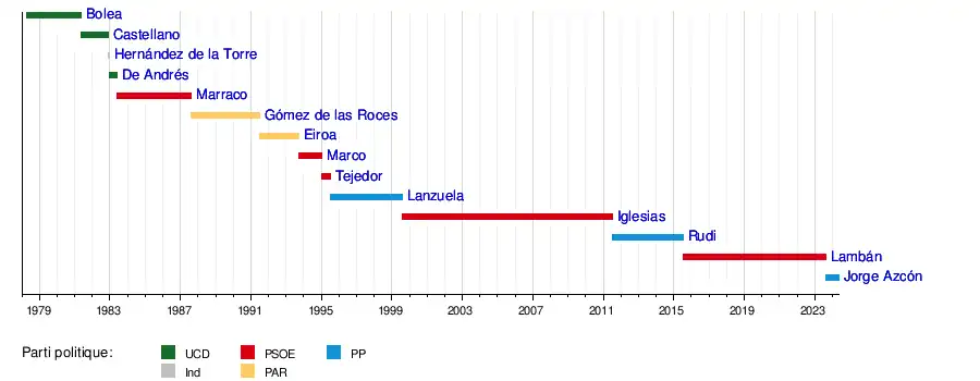 Depuis l'élection régionale de 1983, neuf personnes ont exercé cette fonction (quatre socialistes, deux régionalistes et deux conservateurs), ainsi qu'une par intérim. Le socialiste Marcelino Iglesias détient le record de longévité avec trois mandats successifs de quatre ans, tandis que la conservatrice Luisa Fernanda Rudi est à la seule femme à avoir exercé cette fonction.