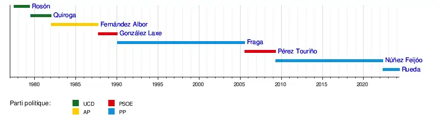 Depuis , la Galice a connu huit présidents : deux issus de l'Union du centre démocratique (UCD) pendant la période pré-autonome, puis quatre du Parti populaire (PP) — et de l'Alliance populaire (AP) — et deux du Parti socialiste ouvrier espagnol (PSOE) depuis l'accession pleine à l'autonomie[24].