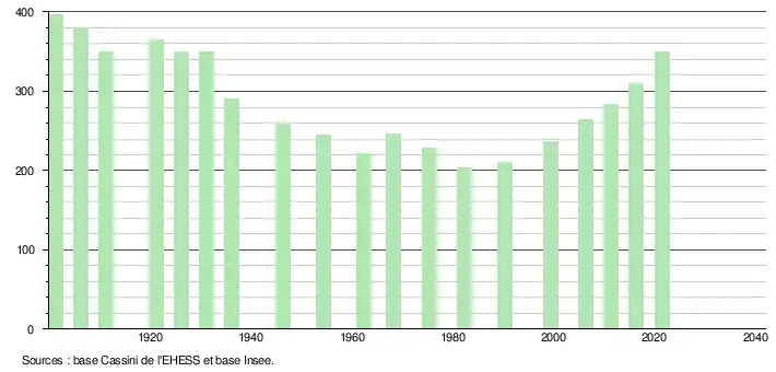 L'évolution du nombre d'habitants est connue à travers les recensements de la population effectués dans la commune depuis 1901. Pour les communes de moins de 10 000 habitants, une enquête de recensement portant sur toute la population est réalisée tous les cinq ans, les populations légales des années intermédiaires étant quant à elles estimées par interpolation ou extrapolation[25]. Pour la commune, le premier recensement exhaustif entrant dans le cadre du nouveau dispositif a été réalisé en 2006[26].