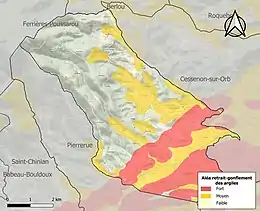 La commune est vulnérable au risque de mouvements de terrains constitué principalement du retrait-gonflement des sols argileux[16]. Cet aléa est susceptible d'engendrer des dommages importants aux bâtiments en cas d’alternance de périodes de sécheresse et de pluie. 48,9 % de la superficie communale est en aléa moyen ou fort (59,3 % au niveau départemental et 48,5 % au niveau national). Sur les 239 bâtiments dénombrés sur la commune en 2019, 222 sont en aléa moyen ou fort, soit 93 %, à comparer aux 85 % au niveau départemental et 54 % au niveau national. Une cartographie de l'exposition du territoire national au retrait gonflement des sols argileux est disponible sur le site du BRGM[17],[Carte 2].