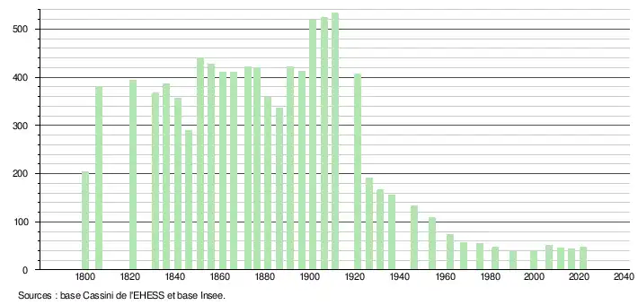 L'évolution du nombre d'habitants est connue à travers les recensements de la population effectués dans la commune depuis 1800. Pour les communes de moins de 10 000 habitants, une enquête de recensement portant sur toute la population est réalisée tous les cinq ans, les populations légales des années intermédiaires étant quant à elles estimées par interpolation ou extrapolation[10]. Pour la commune, le premier recensement exhaustif entrant dans le cadre du nouveau dispositif a été réalisé en 2006[11].