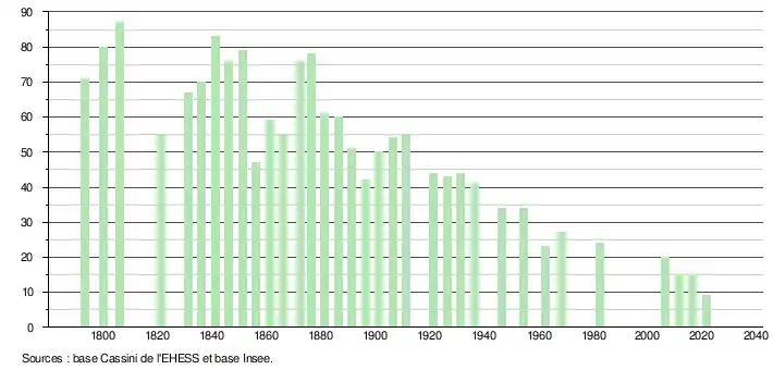 L'évolution du nombre d'habitants est connue à travers les recensements de la population effectués dans la commune entre 1793 et 1973, dans la commune associée de 1973 à 2016 et dans la commune déléguée depuis 2017. À partir de 2006, les populations légales des communes sont publiées annuellement par l'Insee. Le recensement repose désormais sur une collecte d'information annuelle, concernant successivement tous les territoires communaux au cours d'une période de cinq ans. Pour les communes de moins de 10 000 habitants, une enquête de recensement portant sur toute la population est réalisée tous les cinq ans, les populations légales des années intermédiaires étant quant à elles estimées par interpolation ou extrapolation[27]. Pour la commune déléguée, le premier recensement exhaustif, lié à celui de Colombey-les-Deux-Églises, entrant dans le cadre du nouveau dispositif a été réalisé en 2006[28].