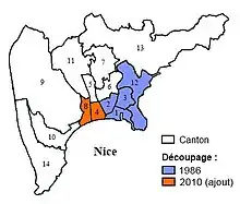 Le redécoupage des circonscriptions réalisé en 2010, en vigueur à partir des élections législatives de 2012, agrandit les limites de la première circonscription. Ainsi, l'ordonnance n°2009-935 du , votée par le Parlement le , lui ajoute les cantons de Nice-4 et Nice-8[5] qui appartenaient à la deuxième circonscription des Alpes-Maritimes. La composition cantonale de la circonscription devient donc jusqu'au redécoupage cantonal de 2014 : Nice-1, Nice-2, Nice-3, Nice-4, Nice-8 et Nice-12[5]. Avec le redécoupage cantonal de 2014, les limites de la circonscription n'ont pas varié mais la composition cantonale de la circonscription est devenue la suivante : une partie de Nice-1 (qu'elle partage avec la 5e circonscription), une partie de Nice-4 (qu'elle partage avec les 3e et 5e circonscriptions), une partie de Nice-5 (qu'elle partage avec la 3e circonscription), une partie de Nice-6 (qu'elle partage avec la 3e circonscription), une partie de Nice-7 (qu'elle partage avec la 3e circonscription), une partie de Nice-8 (qu'elle partage avec la 3e circonscription), et Nice-9[6].