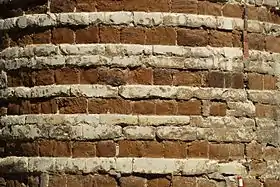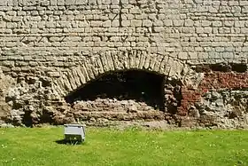 Le niveau inférieur, de couleur plus sombre, est en fait le niveau des fondations du mur d'enceinte : les arches visibles sont les arches des fondations qui étaient jadis enterrées.