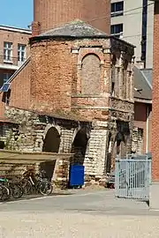 - plus au sud, vers la rue des Frères Mineurs (Minderbroedersstraat), un mur de 40 mètres de long, partiellement intégré à un mur de séparation, et un fragment de tour sur lequel un pavillon de jardin fut bâti en briques au XVIIIe siècle[6], avec des baies de style classique flanquées de pilastres.