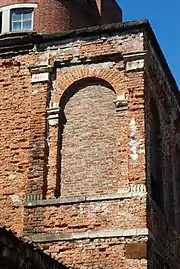 On distingue sur la tour occidentale les vestiges d'une fenêtre aux piédroits harpés et au linteau monolithe à arc en mitre (ou en bâtière) réalisés en grès ferrugineux.