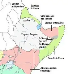 De leur côté, les Britanniques occupent Zeilah et Berbera[15] en 1885. Par ailleurs, l'Angleterre tente de développer son implantation en Égypte et ambitionne de contrôler l'ensemble du bassin du Nil[10]. En 1896, au Soudan voisin, les mahdistes résistent toujours à l'envahisseur britannique mais finissent par céder en 1898[Note 1] ; la même année, la France doit reculer face aux Britanniques à Fachoda[16], sur le Nil, renoncer à contrôler un axe est-ouest du continent africain et réduit donc ses ambitions territoriales en Éthiopie.
