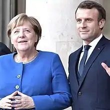 Durant son mandat, Emmanuel Macron doit gérer le retrait du Royaume-Uni de l'Union européenne[2] et les sanctions économiques prises contre la Russie de Vladimir Poutine à la suite de la crise de Crimée[2]. Alors qu'il défend une ligne pro-européenne, il doit également faire face à la crise de la dette publique grecque et la montée en puissance de partis eurosceptiques dans d'autres pays européens[2].