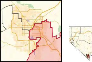 Le 1er district congressionnel du Nevada occupe une partie des communautés du Comté de Clark à l'est de l'Autoroute de Las Vegas et au sud de la Base aérienne de Nellis, y compris des parties de Las Vegas, la plupart de Henderson, Paradise, Sunrise Manor et Winchester, ainsi que l'ensemble de Boulder City, Nelson et Whitney. Avec un indice CPVI de D+3, c'est l'un des districts les plus Démocrates du Nevada[1].