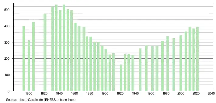 L'évolution du nombre d'habitants est connue à travers les recensements de la population effectués dans la commune depuis 1793. Pour les communes de moins de 10 000 habitants, une enquête de recensement portant sur toute la population est réalisée tous les cinq ans, les populations légales des années intermédiaires étant quant à elles estimées par interpolation ou extrapolation[22]. Pour la commune, le premier recensement exhaustif entrant dans le cadre du nouveau dispositif a été réalisé en 2006[23].