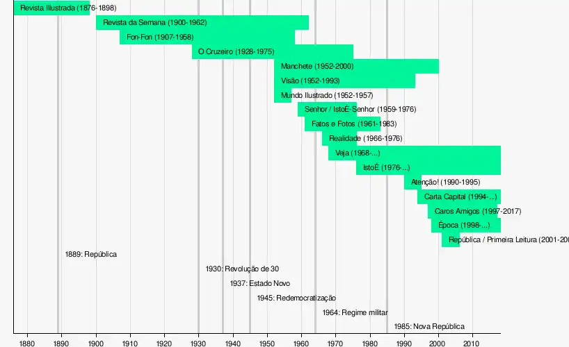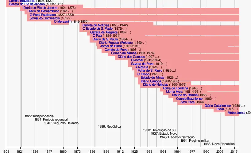 Parmi les journaux de Rio de Janeiro de l'époque impériale, la Gazeta de Notícias et l'O Paiz étaient les plus importants, les plus grands à l'époque et ceux qui ont survécu le plus longtemps, jusqu'à l'ère Vargas. Les autres étaient Diario de Noticias, Correio do Povo, Cidade do Rio, Diario do Commercio, Tribuna Liberal, certains journaux datant d'avant 1889, mais avec une campagne républicaine très forte, comme A Republica, et les magazines de caricature et de satire : Revista Illustrada, O Mequetrefe, O Mosquito et O Bezouro. D'autres étaient Jornal do Commercio et la Gazeta da Tarde.