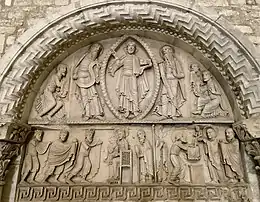 Sur le mur intérieur du croisillon sud se trouve le deuxième tympan qui présente dans une mandorle le Christ, entouré des deux prophètes Moïse et Élie. Les apôtres sont aussi représentés et plusieurs scènes de la vie de Jésus-Christ comme l'Adoration des mages et la Présentation au Temple[10].