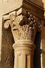 La nef est rythmée par des arcs de décharge latéraux séparés par des colonnes engagées surmontées de chapiteaux ornés de palmettes et de feuilles d'acanthe.